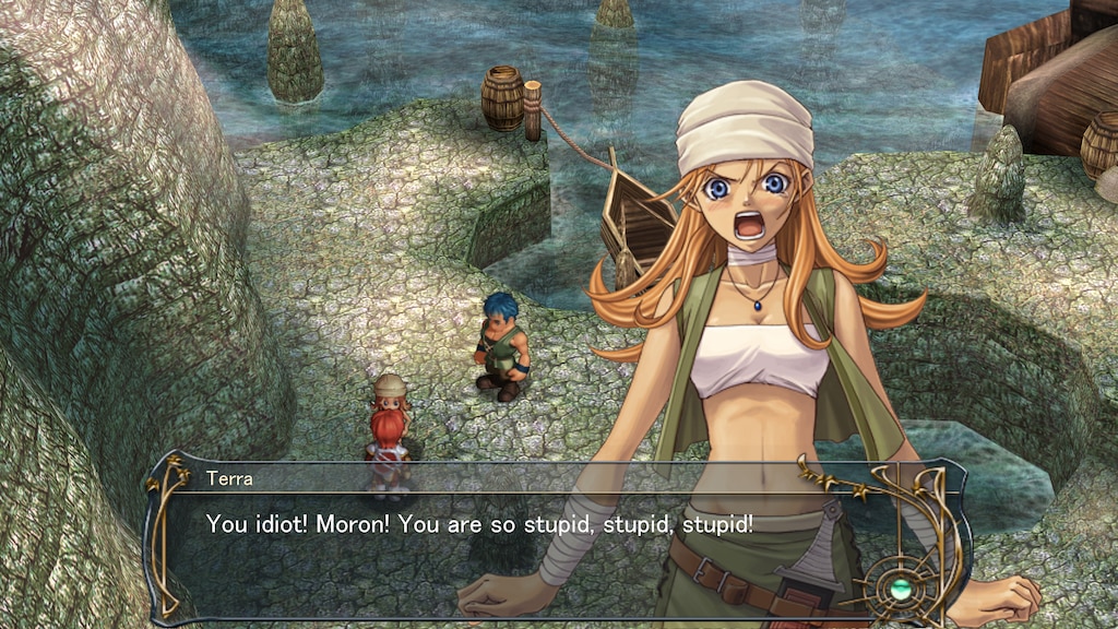 It's hard to find a screenshot that will do it justice, especially to my upscaled 4K output on my retro box. But there's something about the vibes man, they really capture the Ragnarök Online peak JRPG whimsical fantasy era. The lush jungles and blue skies coast of the early 2000s immediately hook my wanderlust. And the most charming thing of all to my shock and disbelief, every character, every line of dialogue, every NPCs is fully voiced in English language.  And not badly either! Every character is doing some interesting accent or performance! It's incredible immersive! Some voices are hilarious and a bit distracting, but this should really have become the standard. Nothing kills some vibes like a JRPG that opens hard and then english dialogue dwindles out replaced for static text. No only that, modern voice acting is so dry. Think of something like Octopath Traveller being a slog. But this game, its exciting to meet and explore and discover every NPC just to see how they sound. It sounds like the voice actors are having fun without Matt Mercer narrating their dice rolls!